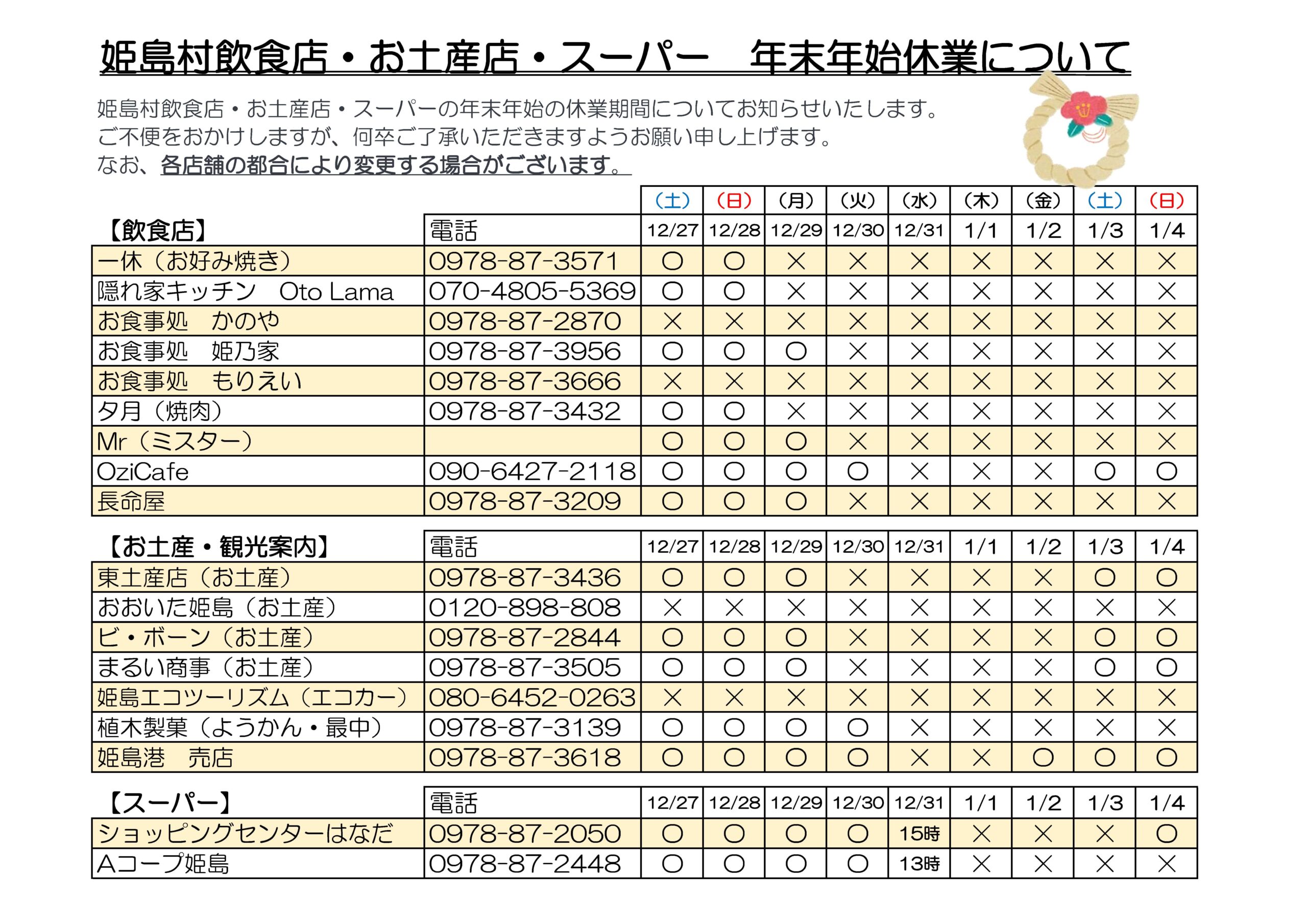 【お知らせ】姫島村 飲食店・お土産店・スーパーの年末年始休業について