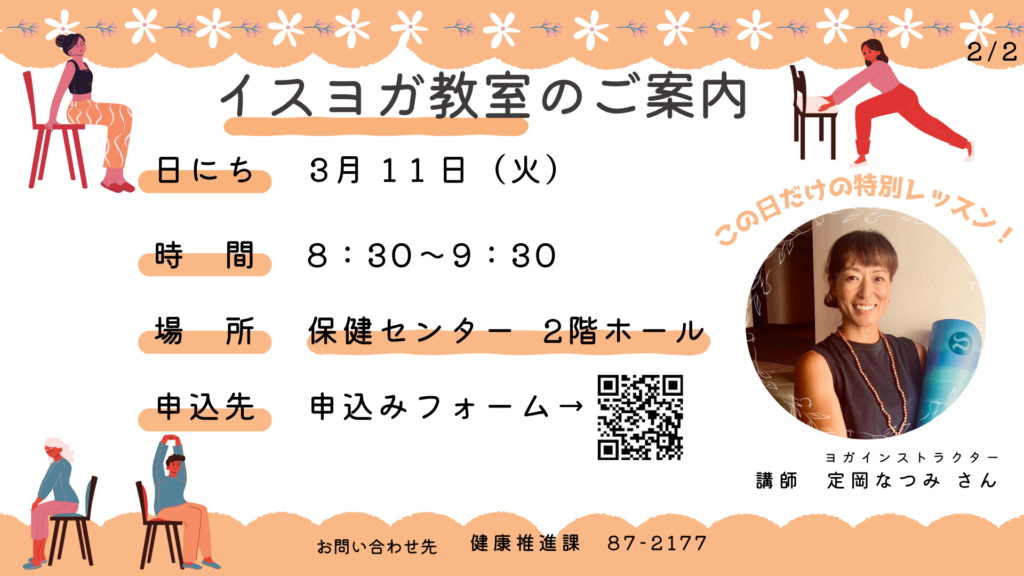 ・日時:令和7年3月10日(月)ヨガ教室 18:30~19:30